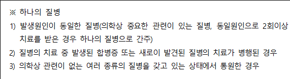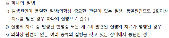 - 동일 질병의 치료목적으로 2회이상 입원한 경우, 동일 입원으로 간주