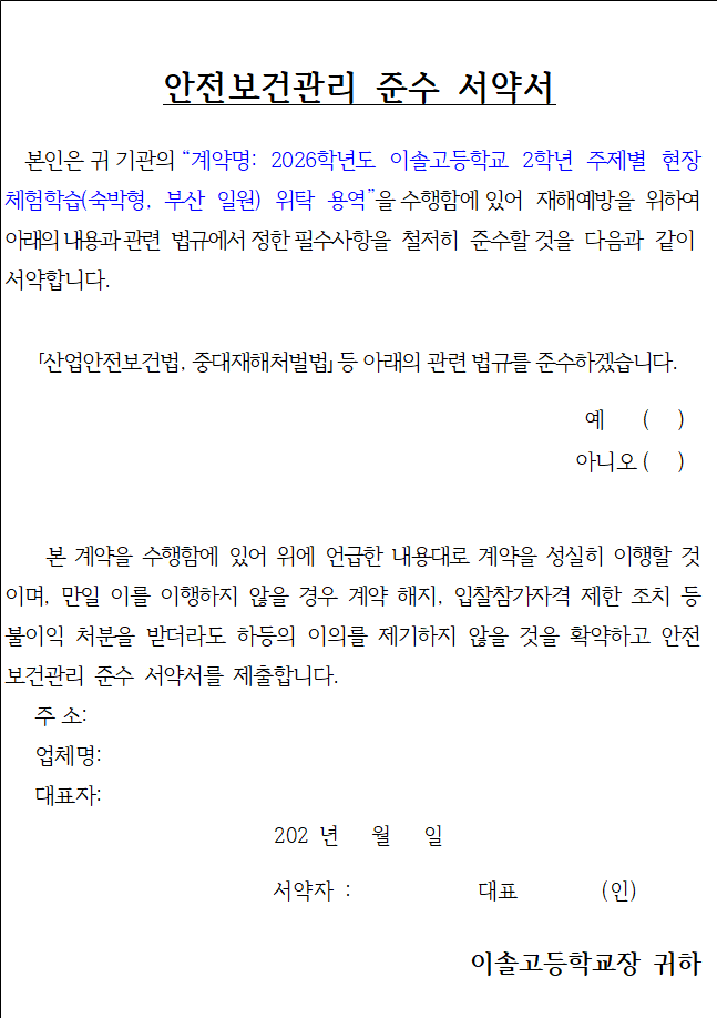 2026학년도 이솔고등학교 2학년 숙박형 현장체험학습 위탁 용역