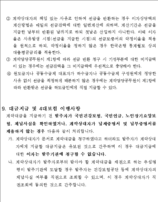 ○ 「지방자치단체를 당사자로 하는 계약에 관한 법률 시행령」제89조 및 「지방자치단체 입찰 및 계약집행기준」에 의거 기성대가 및 준공대가 지급시 정산하여야 합니다.