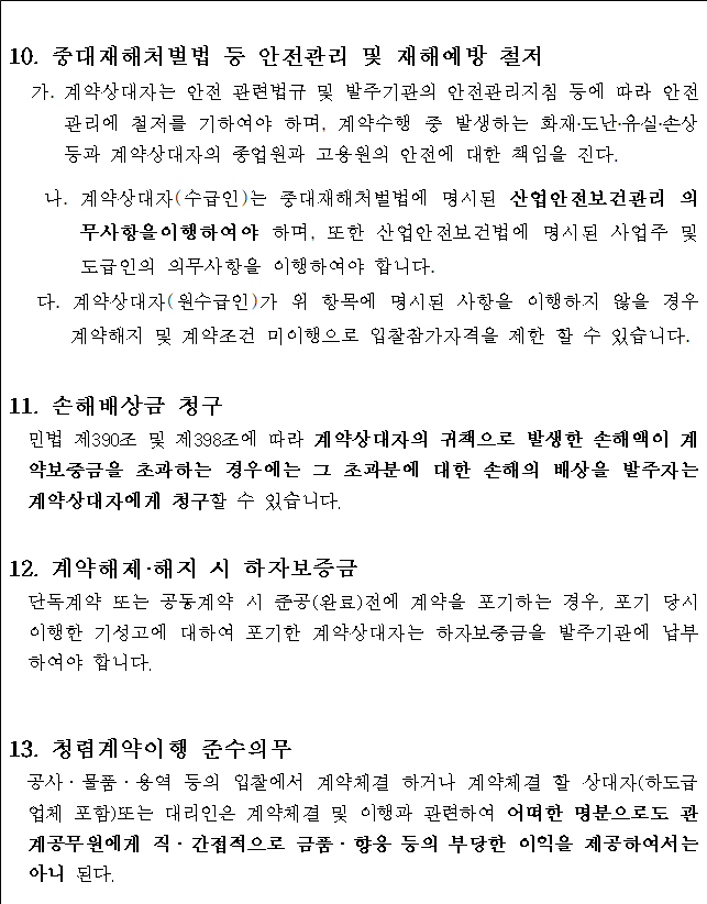 ○ 계약상대자는 「산업안전보건법」 등 관계 법령을 숙지하여 사업주에게 부여된 종사자의 안전 ․ 보건 확보 의무를 성실히 이행하여야 하며, 이를 이행하지 않아 발생된 모든 사고에 대하여 책임을 집니다.
