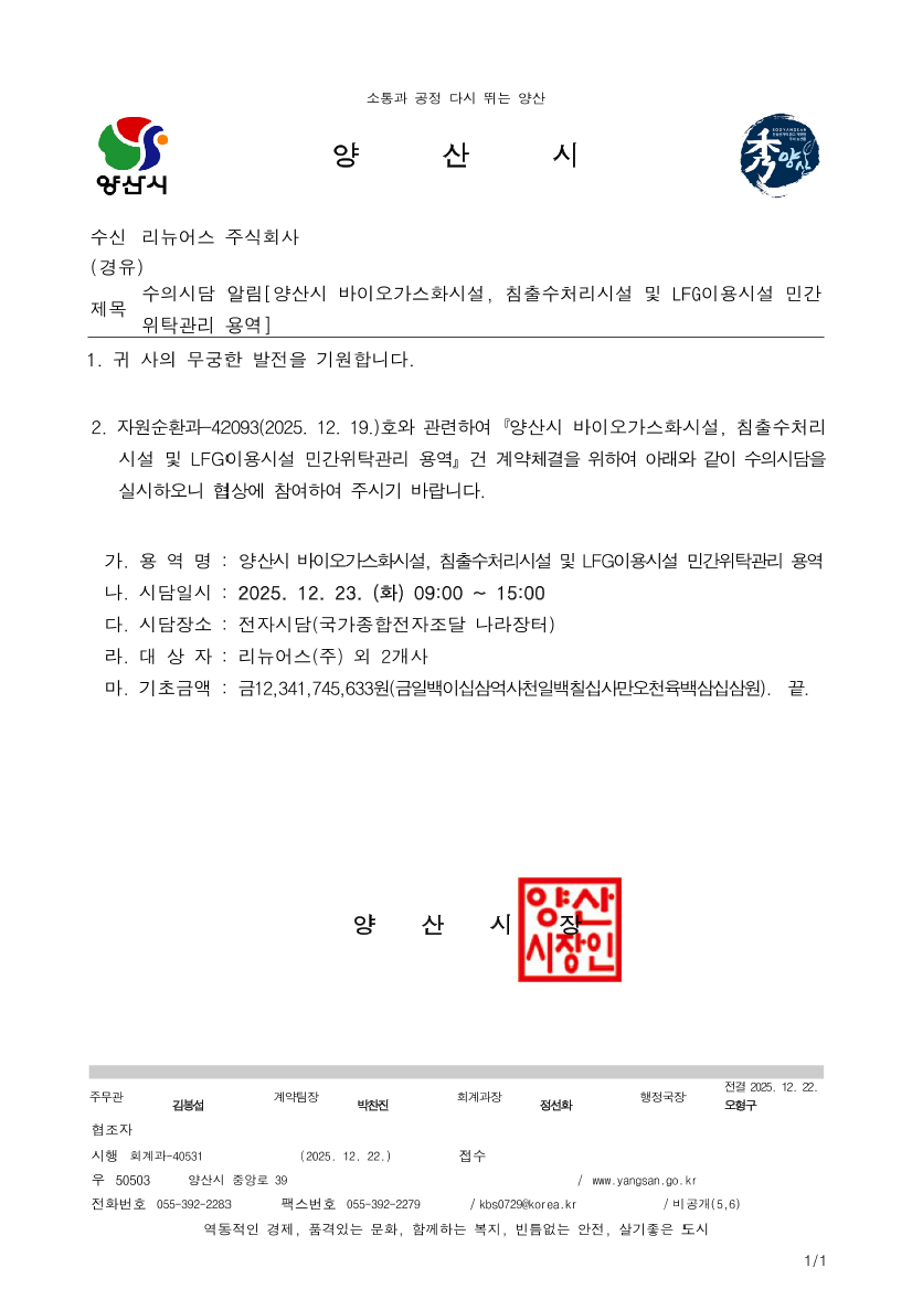 양산시 바이오가스화시설, 침출수처리시설 및 LFG이용시설 민간위탁관리 용역 |