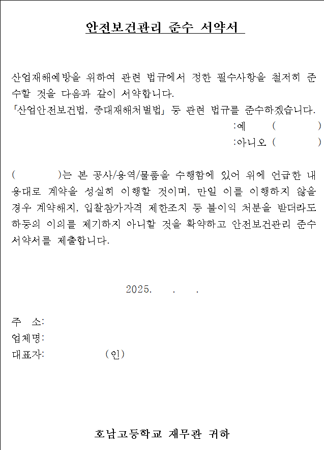 나. 본 입찰(견적)에 참가하고자하는 자는 중대재해 예방을 위한 안전 및 보건 확보 의무사항을 숙지하신 후 입찰(견적)에 응하여야 하며, 계약 체결 시에 【붙임1】「안전보건관리 준수 서약서」를 제출하여야 합니다.