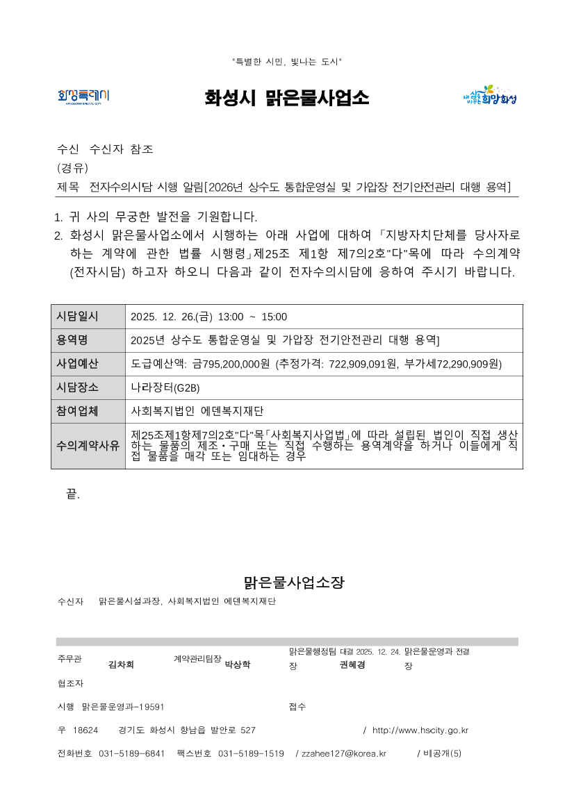 2026년 상수도 통합운영실 및 가압장 전기안전관리 대행 용역 |
