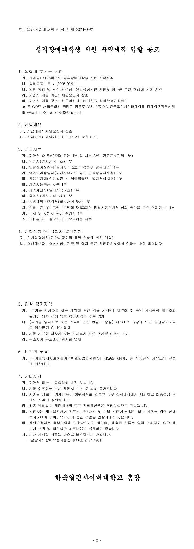 2026학년도 한국열린사이버대학교 청각장애대학생 지원 자막제작업체 선정 |
