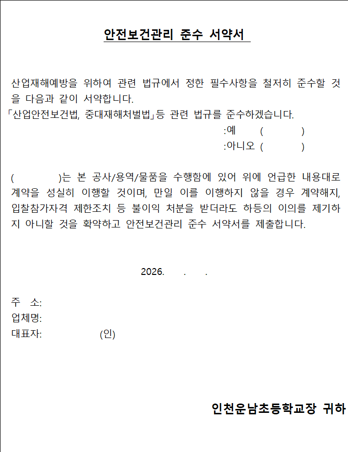 「2026학년도 인천운남초등학교 통학버스 임차 용역」에 참가함에 있어 귀 기관에서 제시한 제반사항을 준수하고 이용객의 안전을 위해 당사의 직영차량으로만 운행을 하며, 이를 위반하였을 경우 계약해지, 위약금 부과 등 어떠한 제재조치를 취하여도 이의를 제기하지 않을 것을 확약합니다.