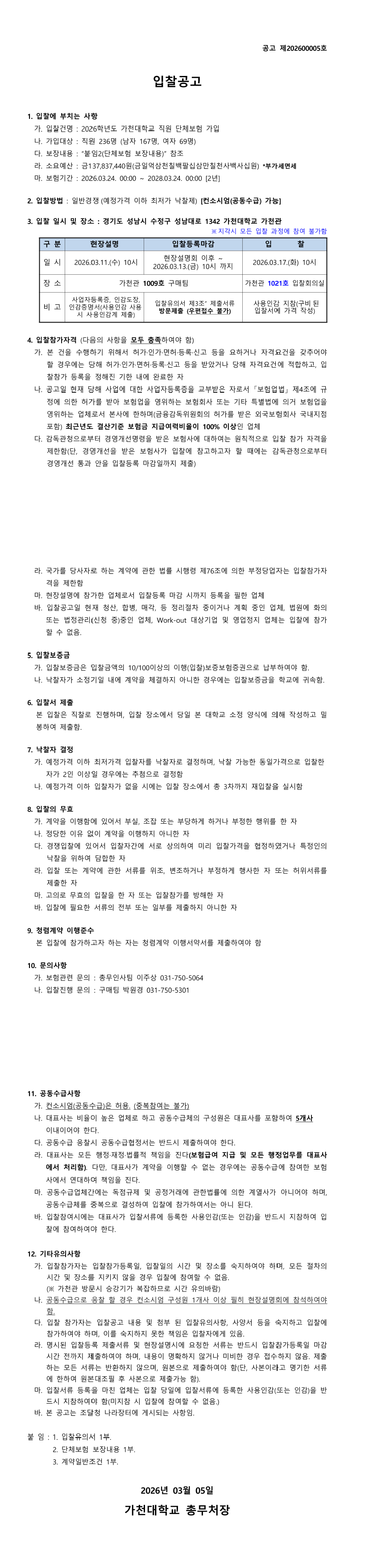 2026학년도 가천대학교 직원 단체보험 가입 |