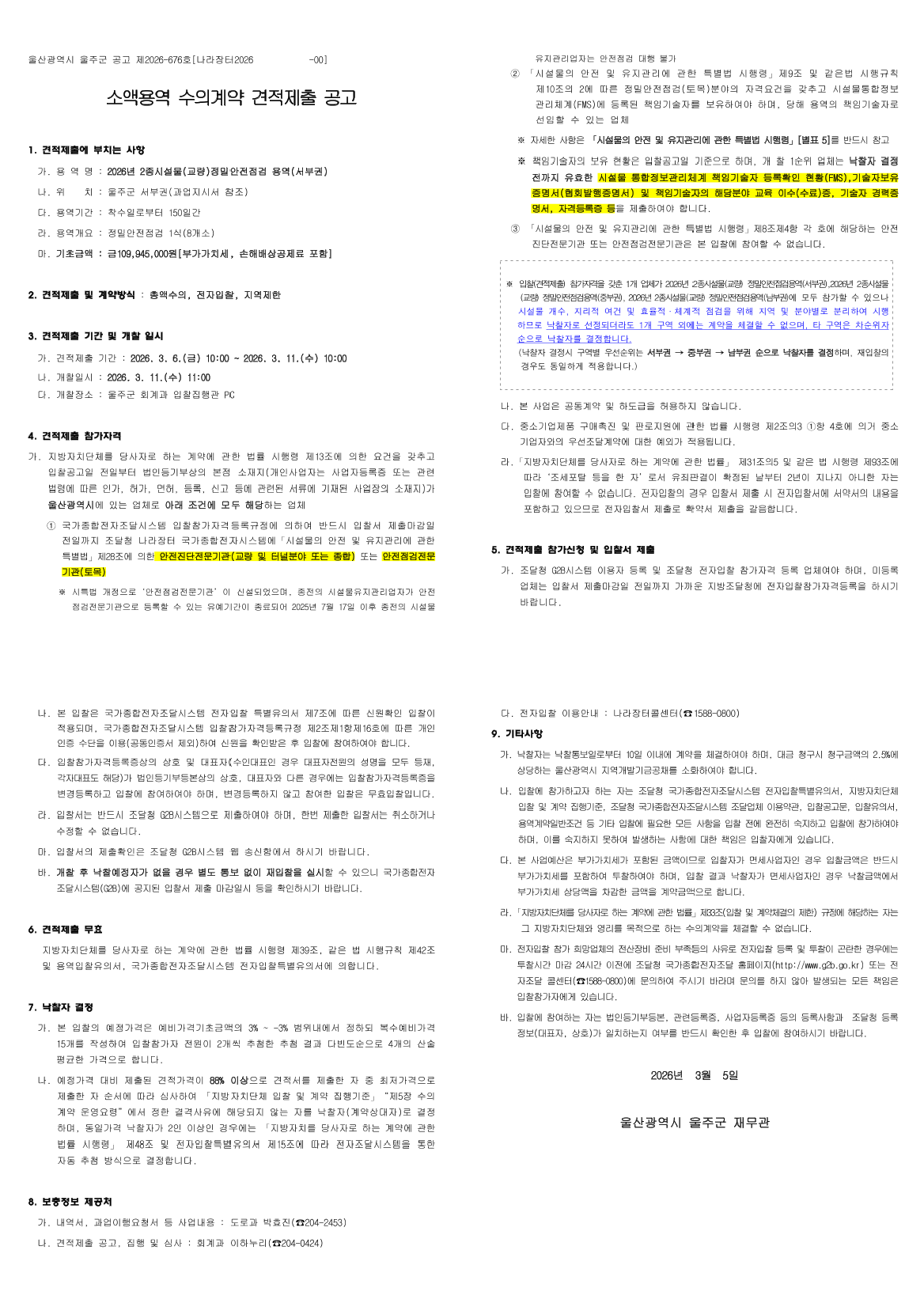 2026년 2종시설물(교량)정밀안전점검 용역(서부권) |