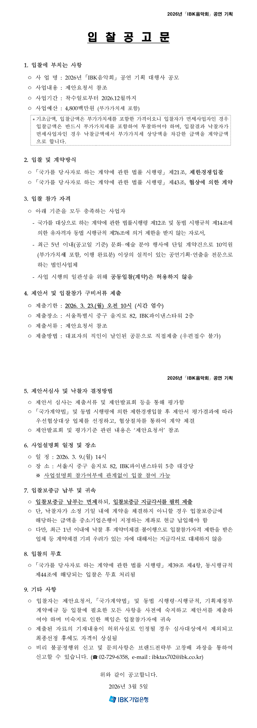 2026년「IBK음악회」공연 기획 대행사 공모 |