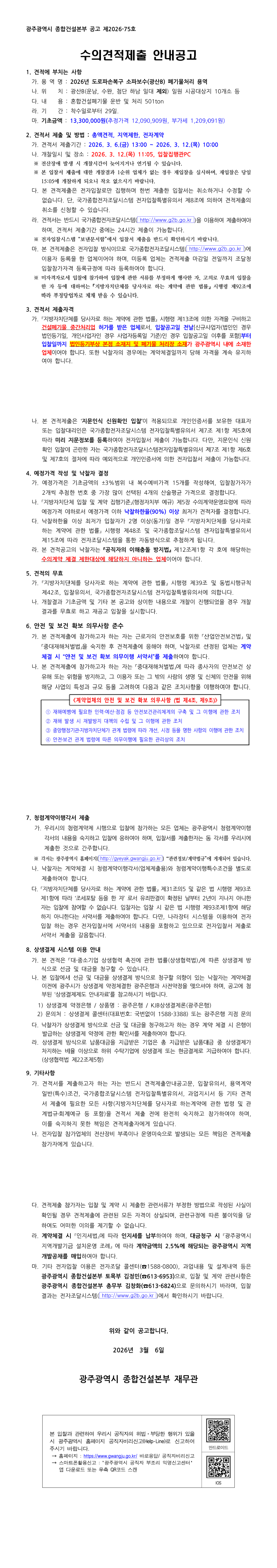 2026년 도로파손복구 소파보수(광산B) 폐기물처리 용역 |