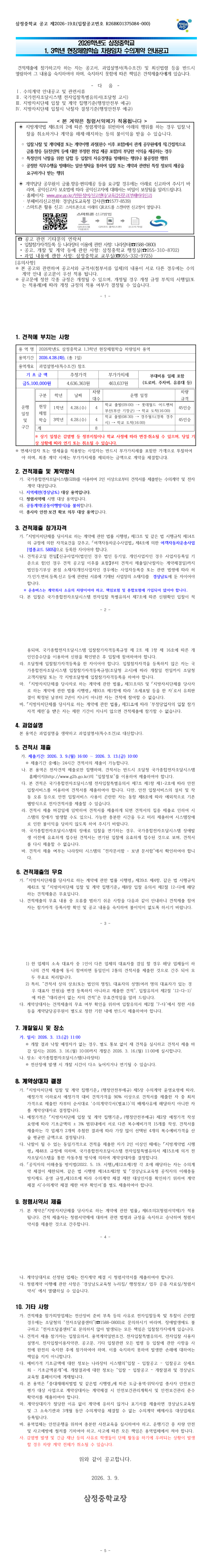2026학년도 삼정중학교 1,3학년 현장체험학습 차량임차 용역 |