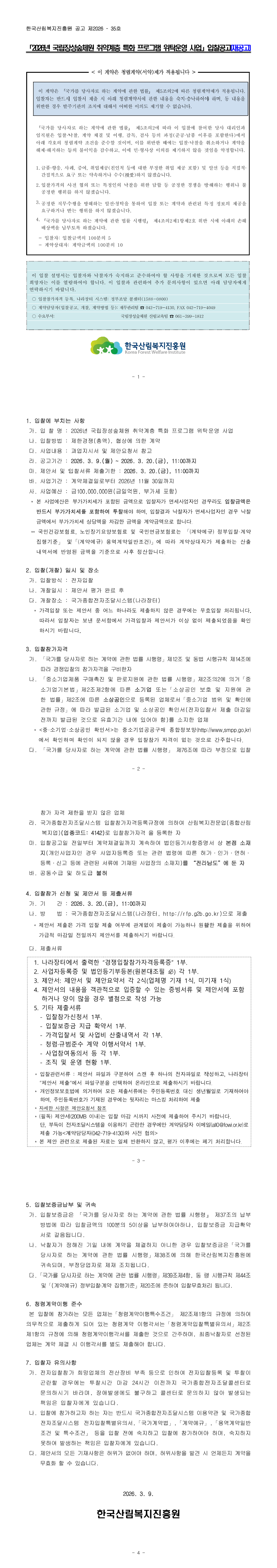 2026년 국립장성숲체원 취약계층 특화 프로그램 위탁운영 사업(재공고) |