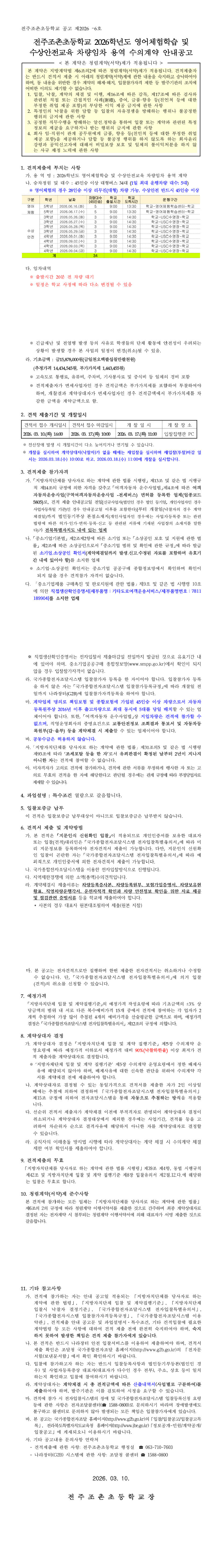 전주조촌초등학교 2026학년도 영어체험학습 및 수상안전교육 차량임차 용역 수의계약 안내공고 |