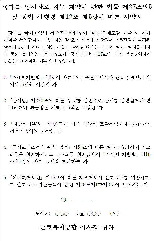당사는 근로복지공단에서 시행하는( ) 계약업체로서 입찰·계약 및 계약의 이행에 있어 깨끗하고 투명한 기업문화의 조성과 인권존중·보호의 가치를 실현하는 윤리적 기업으로서의 실천을 위해 다음 사항을 이행할 것을 서약합니다.