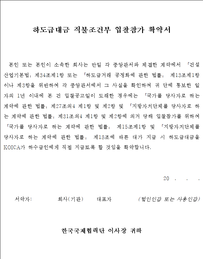만일 사실과 다를 경우(축소, 누락 포함) 평가대상자에서 제외, 우선협상대상자 또는 낙찰자 결정 취소 또는 계약해지·해제 및 부정당업자로 입찰참가자격제한조치 등의 불이익처분을 받더라도 일체의 이의를 제기하지 아니할 것을 확약하고 이에 확인서를 제출합니다.