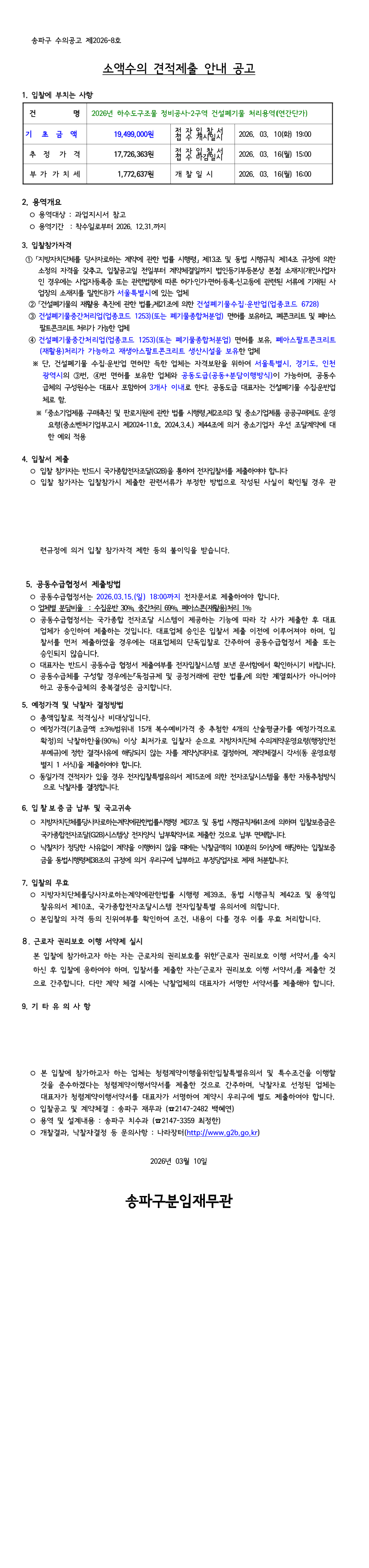 2026년 하수도구조물 정비공사-2구역 건설폐기물 처리용역(연간단가) |