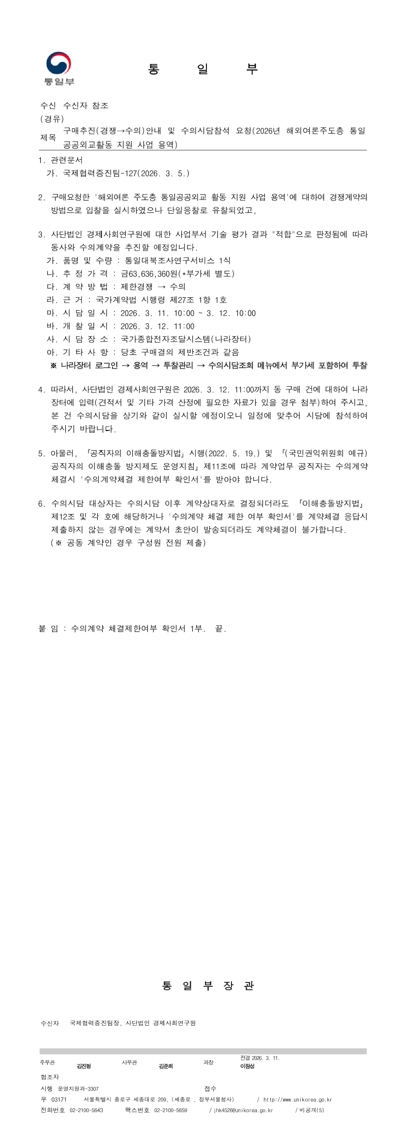 해외여론주도층 통일공공외교 활동 지원 기획 및 운영 용역(긴급)건 2회 유찰후 단일응찰자 적격에 따른 수의시담 공고 |