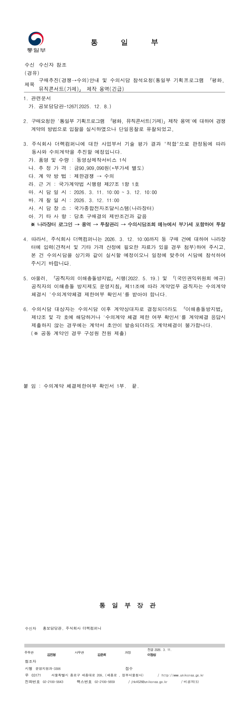 통일부 기획 프로그램 「평화, 뮤직콘서트(가제)」 제작 용역(긴급) 2회 유찰후 단일응찰자 적격에 따른 수의시담 공고 |