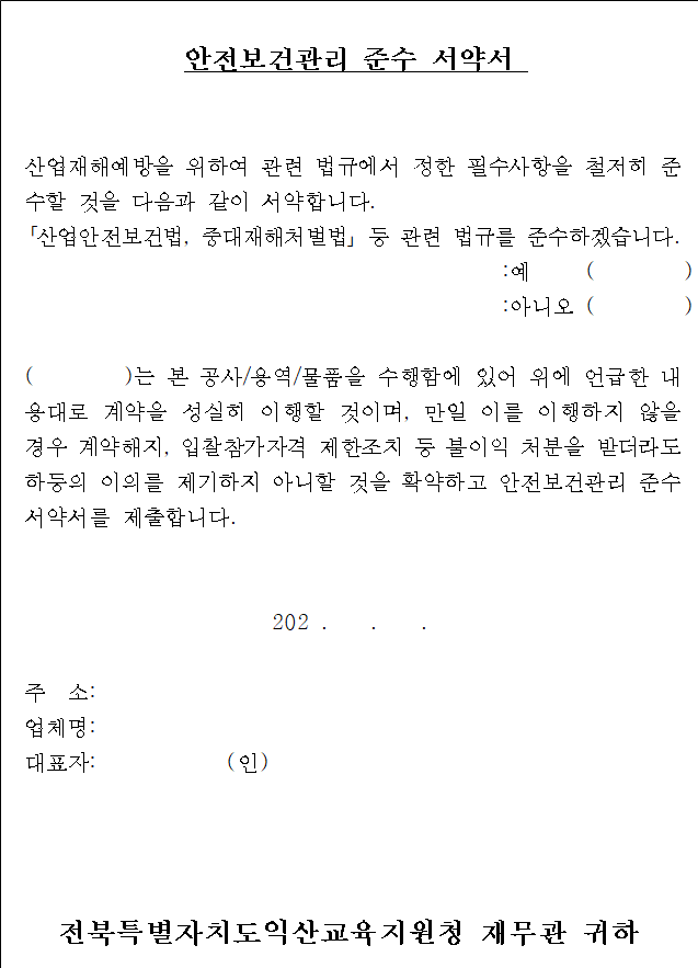 나. 본 입찰에 참가하고자하는 자는 중대채해 예방을 위한 안전 및 보건 확보 의무사항을 숙지하신 후 입찰에 응하여야 하며, 계약 체결 시에 【붙임 1】「안전보건관리 준수 서약서」를 제출하여야 합니다.