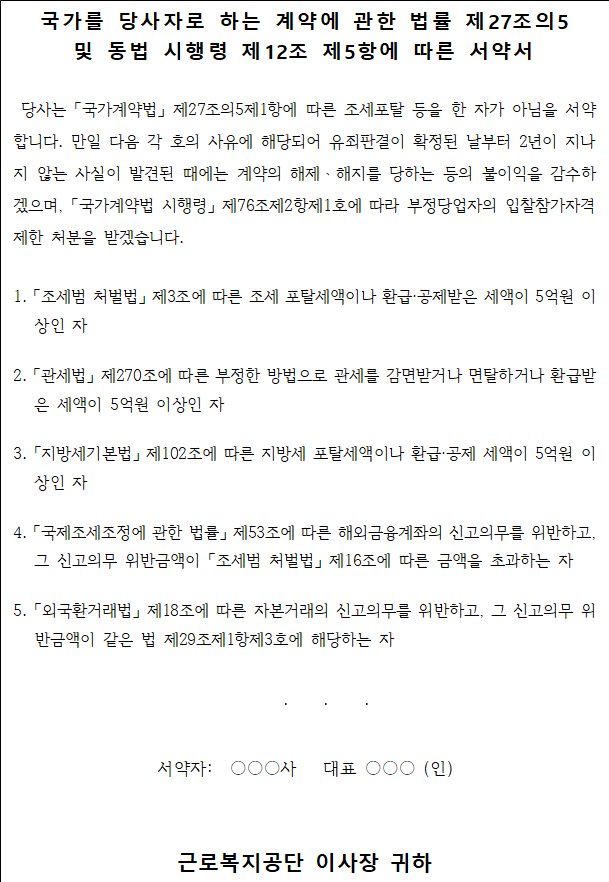 2) 입찰자는 「같은 법 시행령」 제12조제3항각호에 해당하지 아니한다는 서약서[붙임3 참조]를 입찰시 제출하여야 합니다.