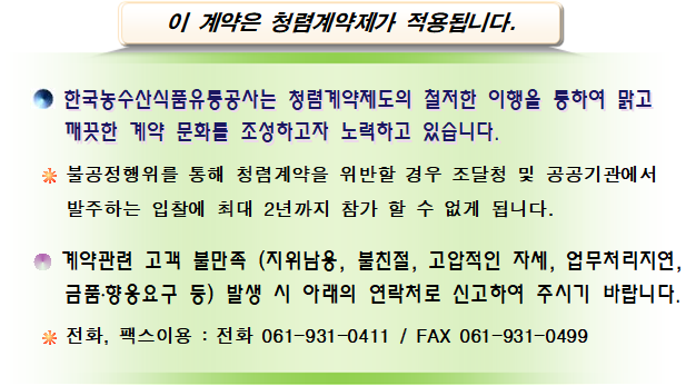 청렴계약이행준수 : 본건은 청렴계약이행 대상으로 입찰에 참가하는 자는 청렴계약이행을 위한 청렴계약입찰특별유의서 및 청렴계약특수조건을 자세히 알고 입찰에 참가하여야 하며, 동 내용은 우리 공사 홈페이지(www.at.or.kr) "공고 → 중소기업관련자료 → 표준양식"에서 자세히 볼 수 있습니다.