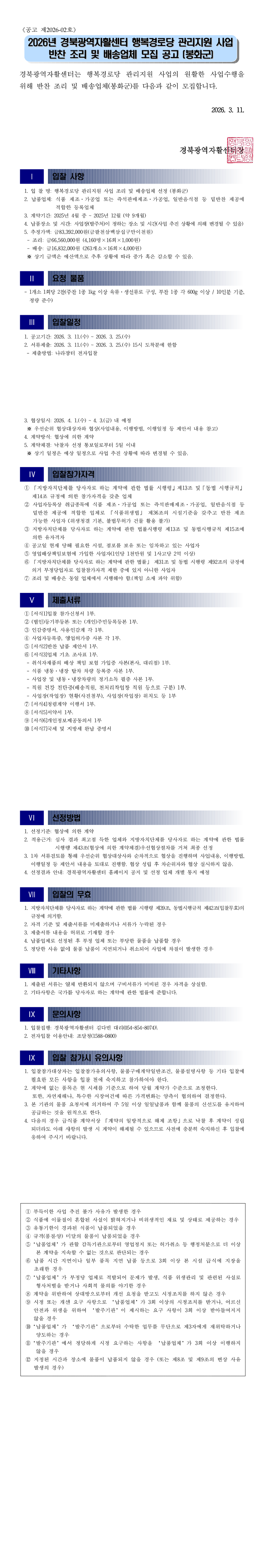2026년 경북광역자활센터 행복경로당 관리지원 사업 조리 및 배송 업체 선정 입찰(봉화군) |