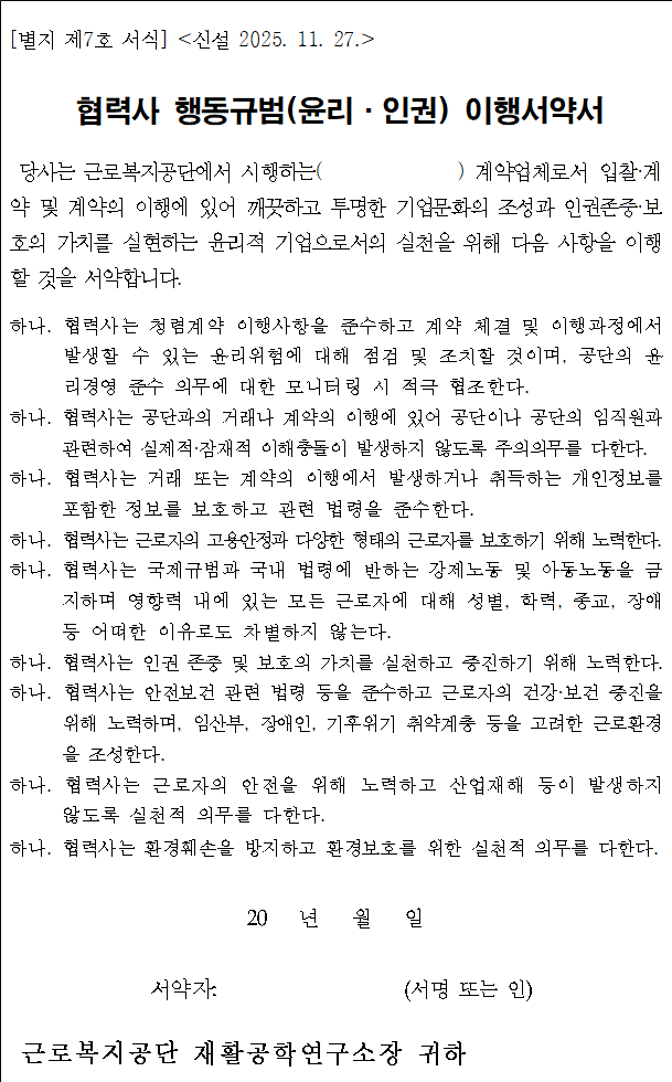 다만, 계약 체결 시에는 낙찰업체의 대표자가 서명한 ‘협력사 행동규범(윤리∙인권) 이행서약서’를 제출하여야 합니다.