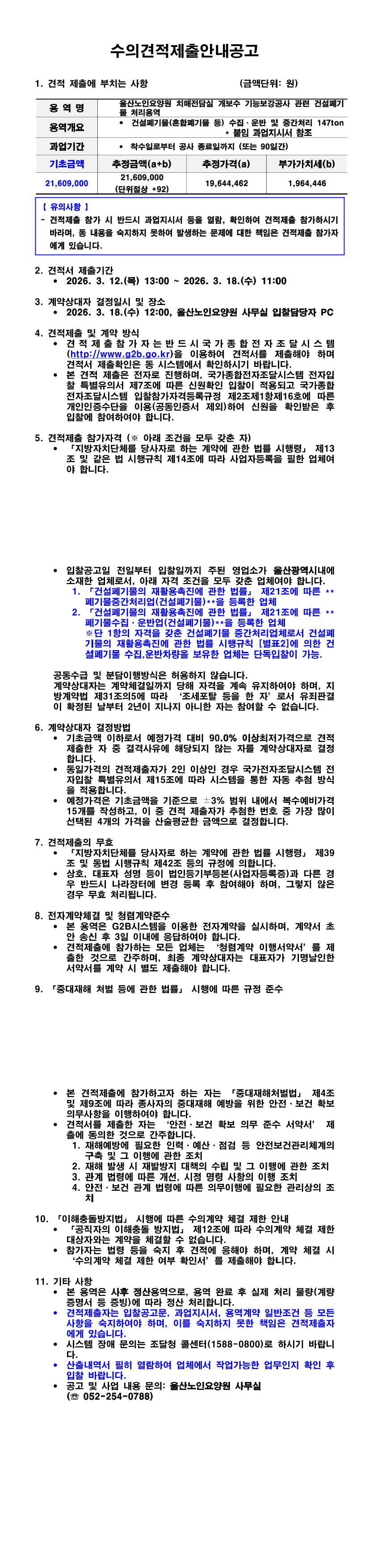 울산노인요양원 치매전담실 개보수 기능보강사업 건설폐기물처리용역 |