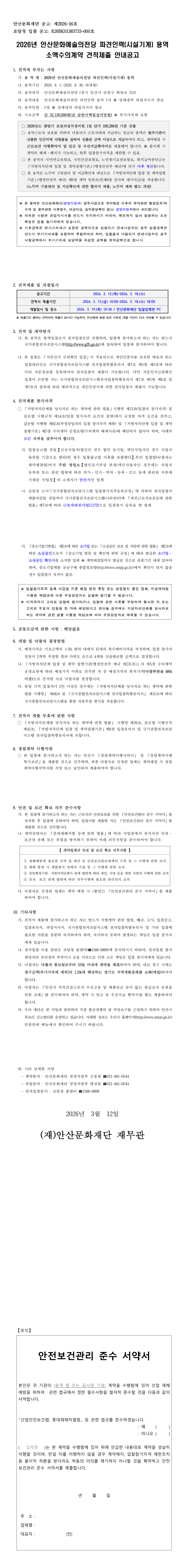 2026년 안산문화예술의전당 파견인력(시설기계) 용역 소액수의계약 견적제출 안내공고 |