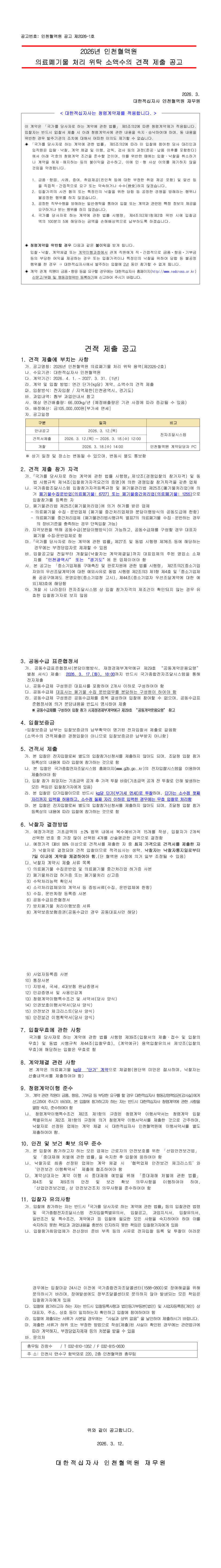 2026년 인천혈액원 의료폐기물 처리 위탁 소액수의 견적 제출 공고 |