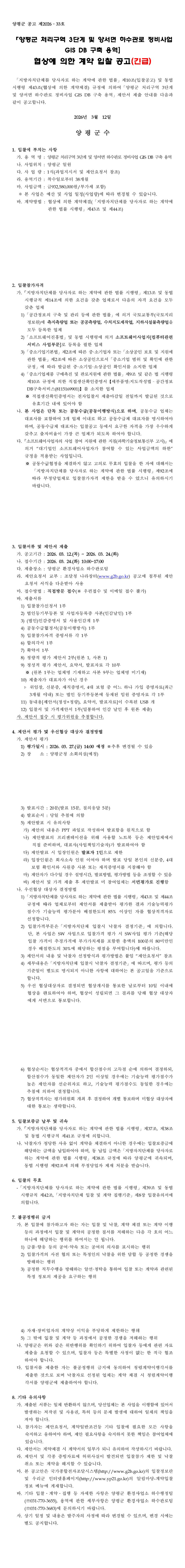 제안서 제출안내 공고[양평군 처리구역 3단계 및 양서면 하수관로 정비사업 GIS DB 구축 용역(협상에의한계약)] |