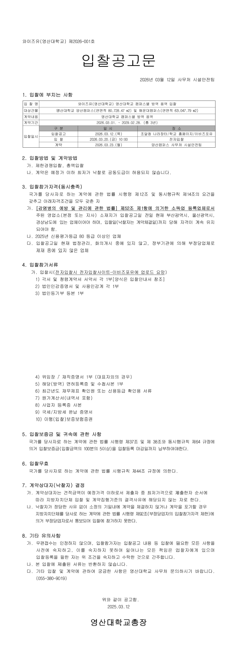 와이즈유(영산대학교) 영산대학교 캠퍼스별 방역 용역 입찰 |