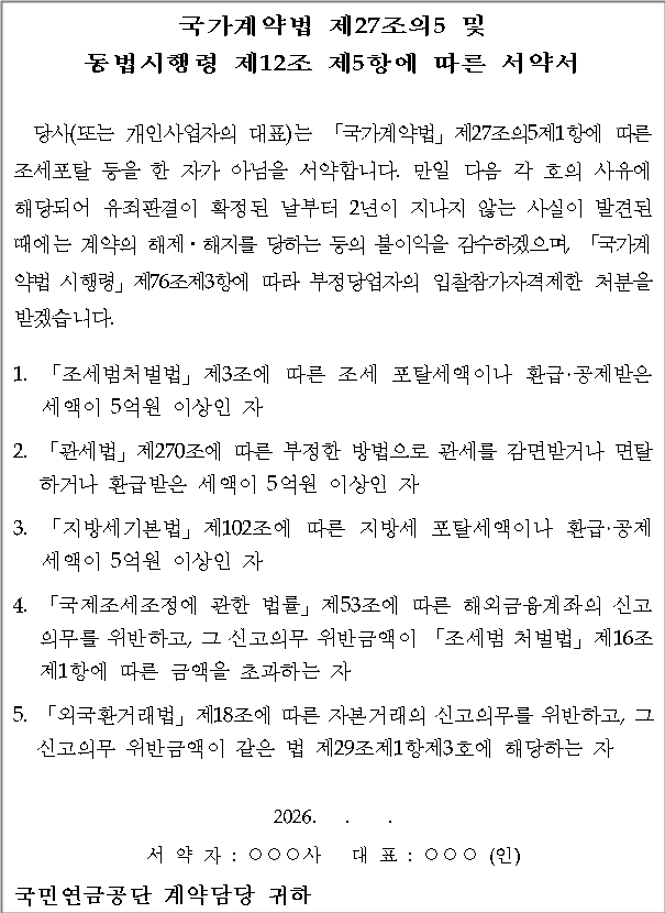 우리 공단은 “2026년 장애심사인력 교육 위탁 운영” 계약 체결 및 집행과 관련하여 「(계약예규) 정부 입찰·계약 집행기준」제98조의4에 따라 아래 각 호의 사항을 준수할 것을 서약합니다.