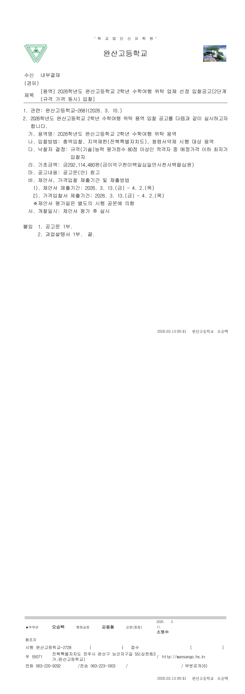 2026학년도 완산고등학교 2학년 수학여행 위탁 용역 업체선정 |