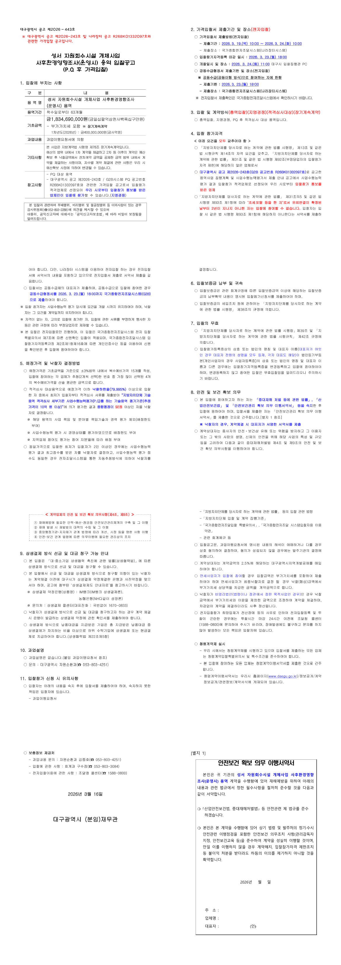 성서 자원회수시설 개체사업 사후환경영향조사(운영시) 용역(P.Q 후 가격입찰 공고) |