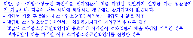 ◆ 중소기업확인서는 전자입찰서 제출마감일 전일까지 발급된 것으로 유효기간 내에 있어야 하며, 중소기업 공공구매 종합정보망(smpp.go.kr)에서 확인하여 확인이 되지 않을 경우 입찰참가자격이 없습니다.