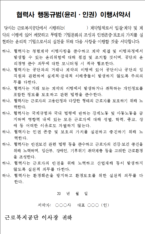 다만, 계약 체결시에는 낙찰업체의 대표자가 서명한 ‘협력사 행동규범 이행서약서’를 제출하여야 합니다.