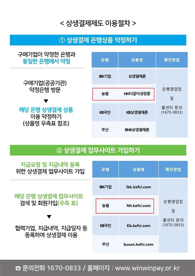 - 상생결제 약정은행(상품명): 농협은행(NH다같이 성장론)