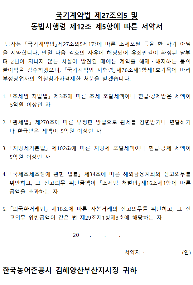 우리 공사의 계약 및 계약이행 과정에서 계약담당 직원들은 다음 각 호에 열거된 공정성을 저해하는 행위를 하지 않겠으며, 업무의 공정성을 확보하고 국민의 권익을 보호하여 공정한 사회를 구현하고자 우리 공사에서 체결하는 모든 계약에 대하여 공정계약을 이행할 것을 서약합니다.
