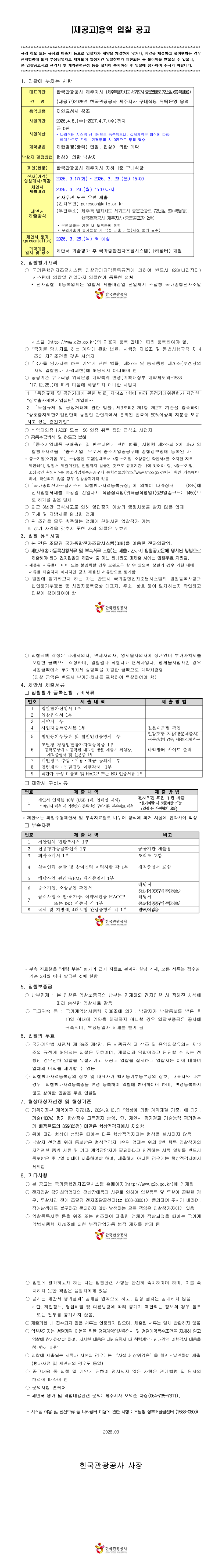 (재공고)2026년 한국관광공사 제주지사 구내식당 위탁운영(긴급공고) |