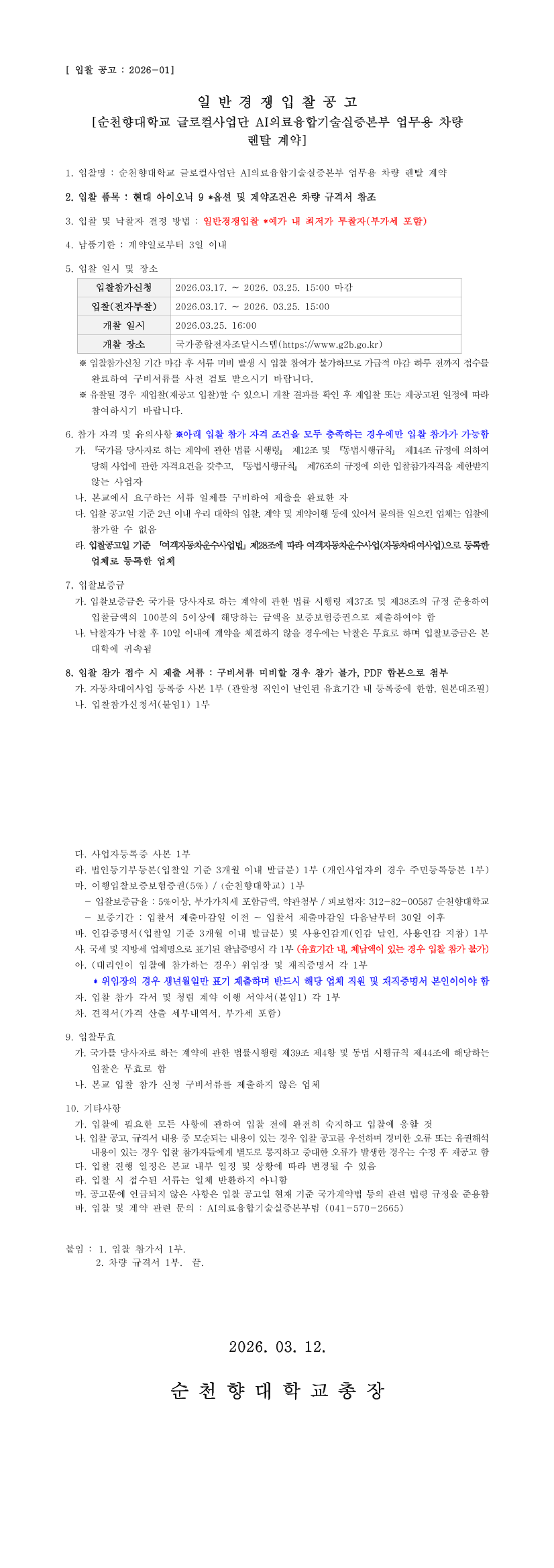 순천향대학교 글로컬대학사업단 AI의료융합기술실증본부 업무용 차량 렌탈 계약 |