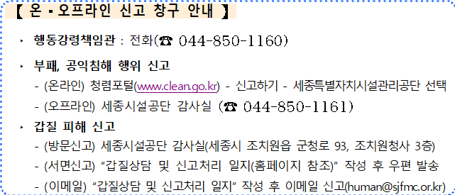 2. 종사자로부터 유해·위험요인에 대한 신고가 접수될 경우 보수·보강 등 개선 작업을 신속하게 조치하고, 세종특별자치시 및 관계행정기관의 이행 명령에 따른 개선사항을 성실히 이행하겠습니다.