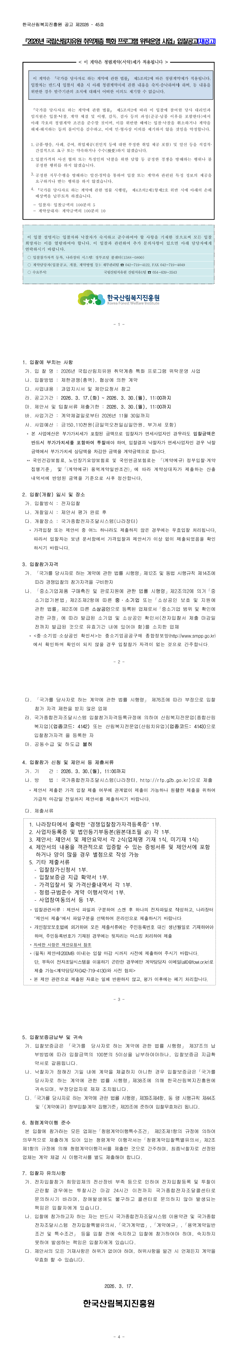 2026년 국립산림치유원 취약계층 특화 프로그램 위탁운영 사업(재공고) |