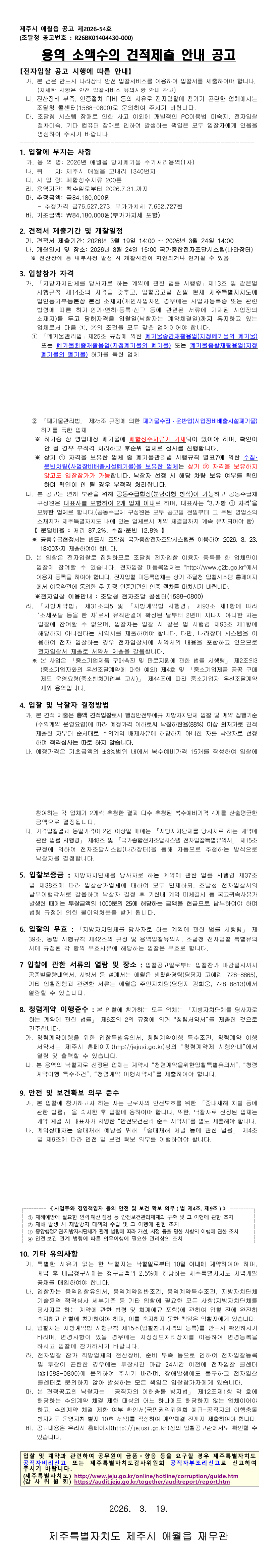 소액수의계약 공고문[2026년 애월읍 방치폐기물 수거처리용역(1차)] |
