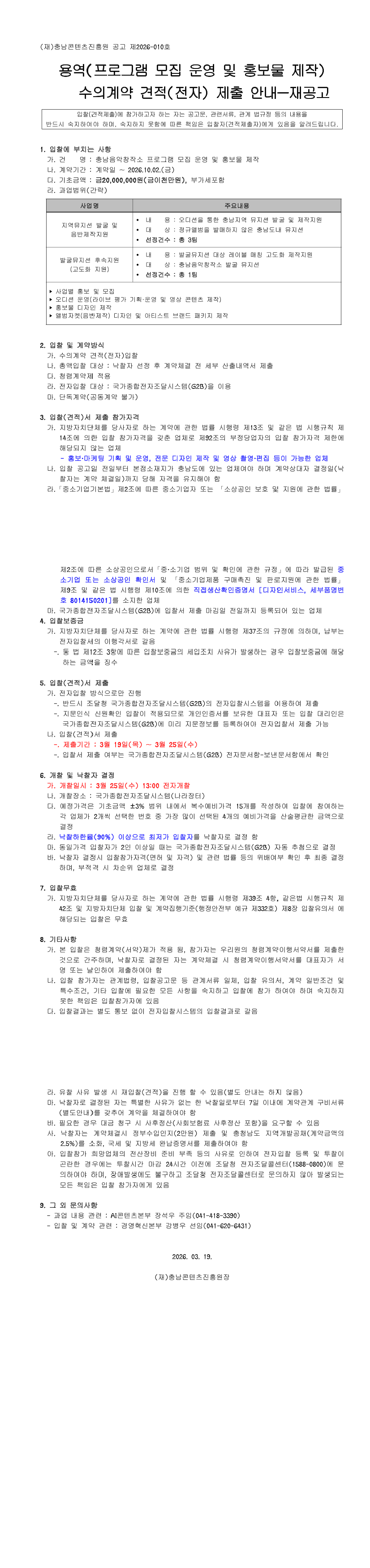 2026 충남음악창작소 프로그램 모집 운영 및 홍보물 제작 용역 |