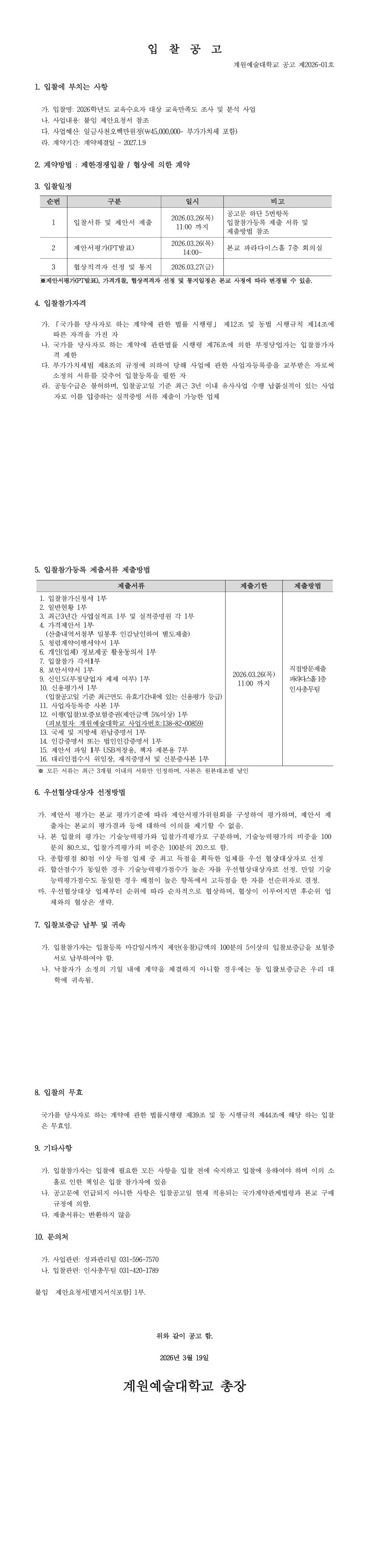 계원예술대학교 2026년 교육수요자 대상 교육만족도 조사·분석 용역 사업 |