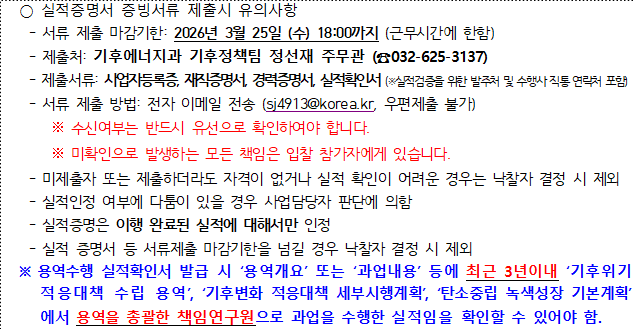 다. 입찰공고일 기준 최근 3년 이내 국가 또는 지방자치단체에서 발주한「기후위기(변화) 적응대책 수립 용역」,「탄소중립 녹색성장 기본계획」단일용역에서 책임연구원 (용역총괄)으로 과업을 수행하고, 해당 분야에서 3년 이상 종사한 경력이 있는 자를 ‘책임연구원’으로 1인 이상 포함하여야 함.