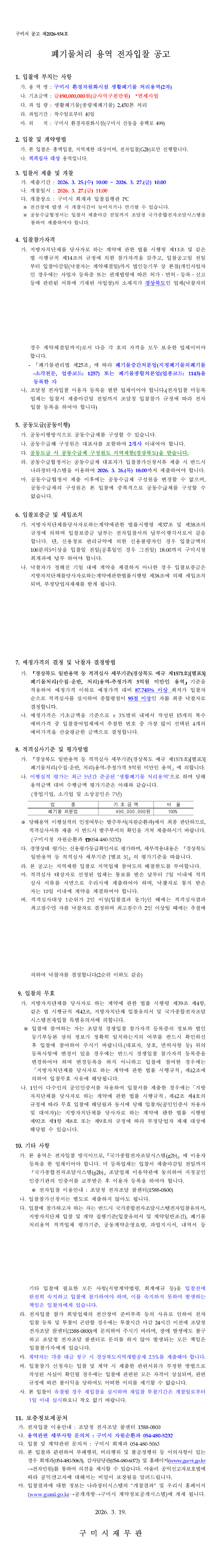 구미시 환경자원화시설 생활폐기물 처리용역(2차) |