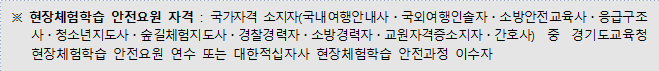 ※ 안전요원(주간, 야간)은 경기도교육청 「안전한 현장체험학습 운영지침」에 명시된 자격자로 업체는 안전요원을 채용 전에 성범죄 경력·아동학대 관련 범죄조회 실시 결과 이상이 없는 자를 선발함. 추후, 주제별 체험학습 실시 7일전까지 구비서류(안전교육이수증, 조회결과회신 서 등)을 제출해야함