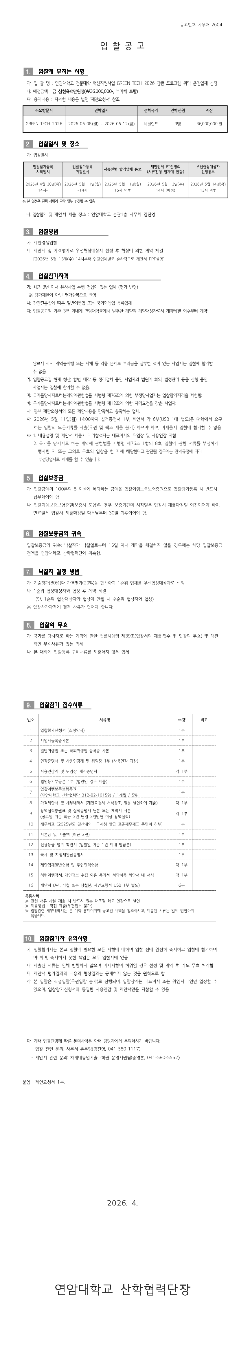 연암대학교 전문대학 혁신지원사업 GREEN TECH 2026 참관 프로그램 위탁 운영업체 선정 입찰 |