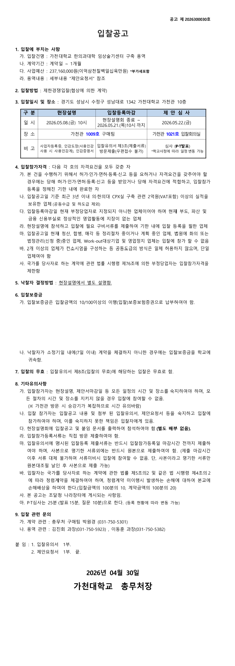 가천대학교 한의과대학 임상술기센터 구축 용역 |
